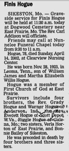Survivors include four brothers, the Rev. Grady Hogue and Warner Hogue of Anderson, Ind., the Rev. Everett Hogue of Scott Depot, W.Va., Riggle Hogue of Galena, Mo.; two sisters, Verla Horton of East Prairie, and Bonnie Bailey of Sikeston.